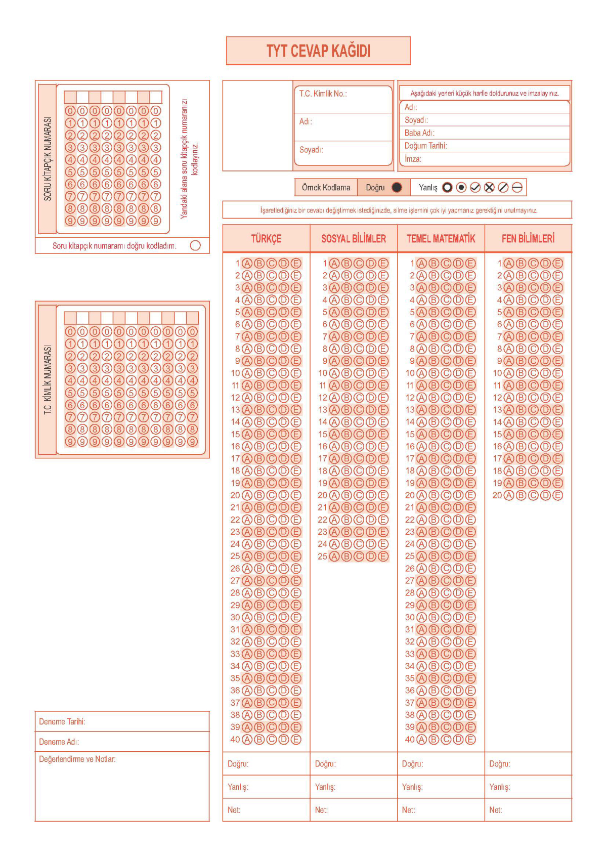 50'Lİ OPTİK FORM RENKLİ A4 ŞEKLİNDE